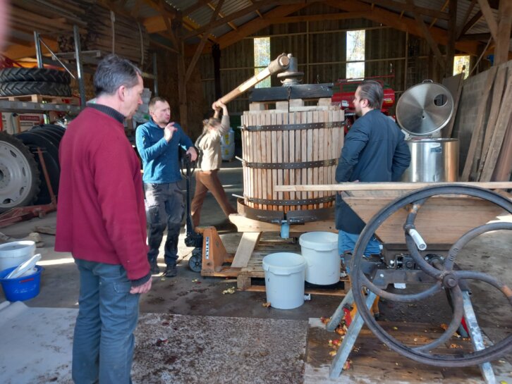 Un pressoir et un grugeoir entièrement remis à neuf par Olivier, notre "mac Gyver" local, quelques vieux tonneaux et plein de bonnes volontés ... nous voilà lancés pour une nouvelle aventure et de bons moments... Affaire à suivre !