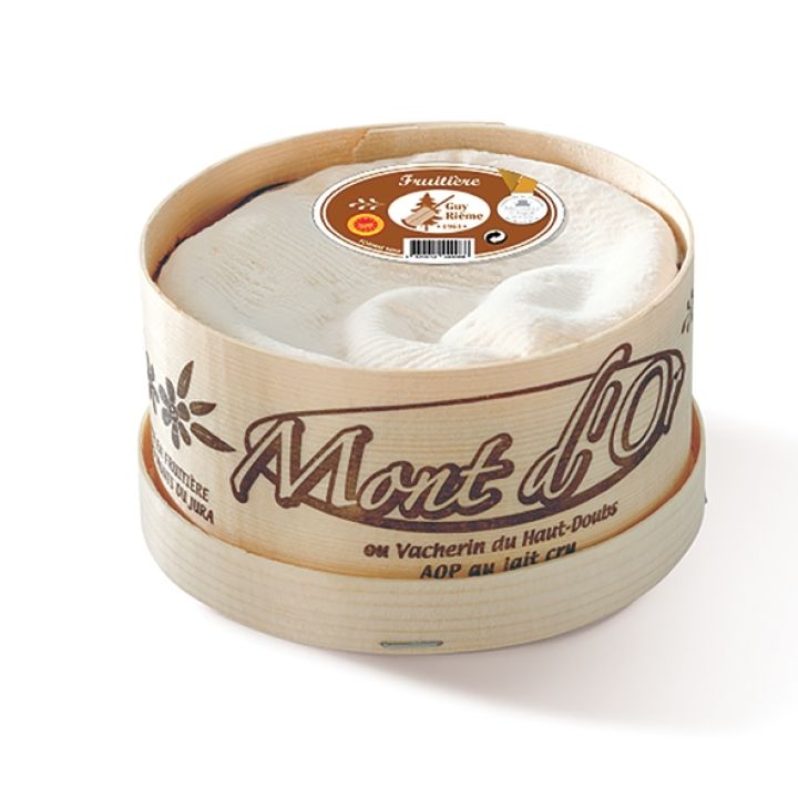 - Mont d’Or AOP au lait cru, affiné par la Fruitière Guy Rième. Sangle d’épicéa traditionnelle, pâte souple et crémeuse, aux notes lactées et légèrement boisées. Une texture fondante caractéristique, maîtrisée par un affinage précis qui signe la qualité artisanale de Guy Rième. -Haut-Doubs (11 € la pièce)Mont d'or baby Rieme
